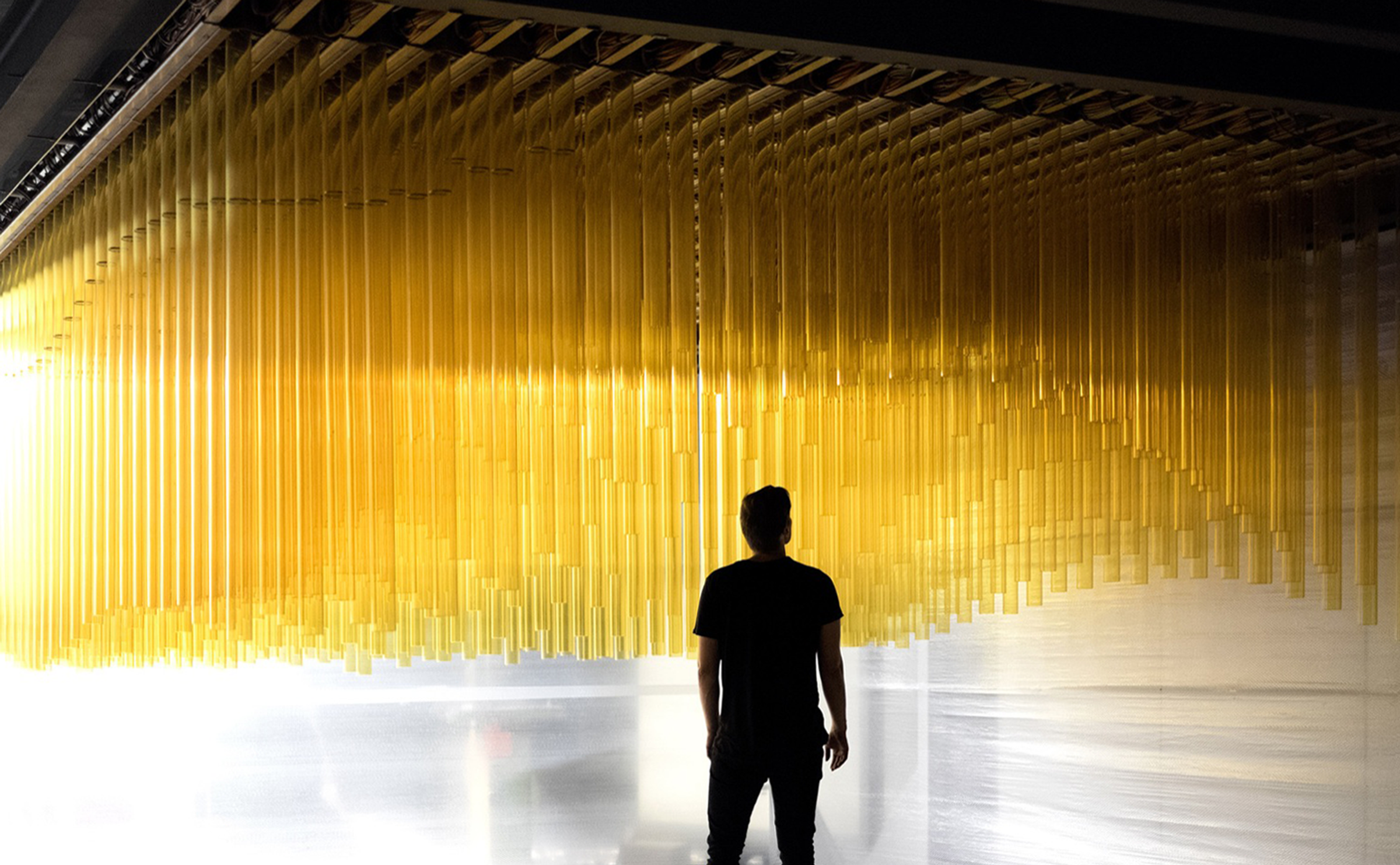 The installation featured an abstract representation of underground landscapes through a matrix of 529 acrylic pipes that pierced the ceiling between the first and second floors, creating organic rock-like formations below and an ocean surface effect above. Visitors were invited to interact with the installation by moving through the space underneath, where the pipes, which normally hung 1.3 meters above ground, would lift to create protective domes around each person. This inverse movement created wave-like motions on the upper floor, with both levels remaining accessible while the second floor was enclosed by glass walls for safety.