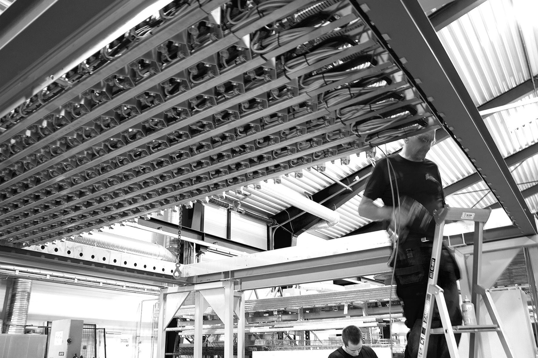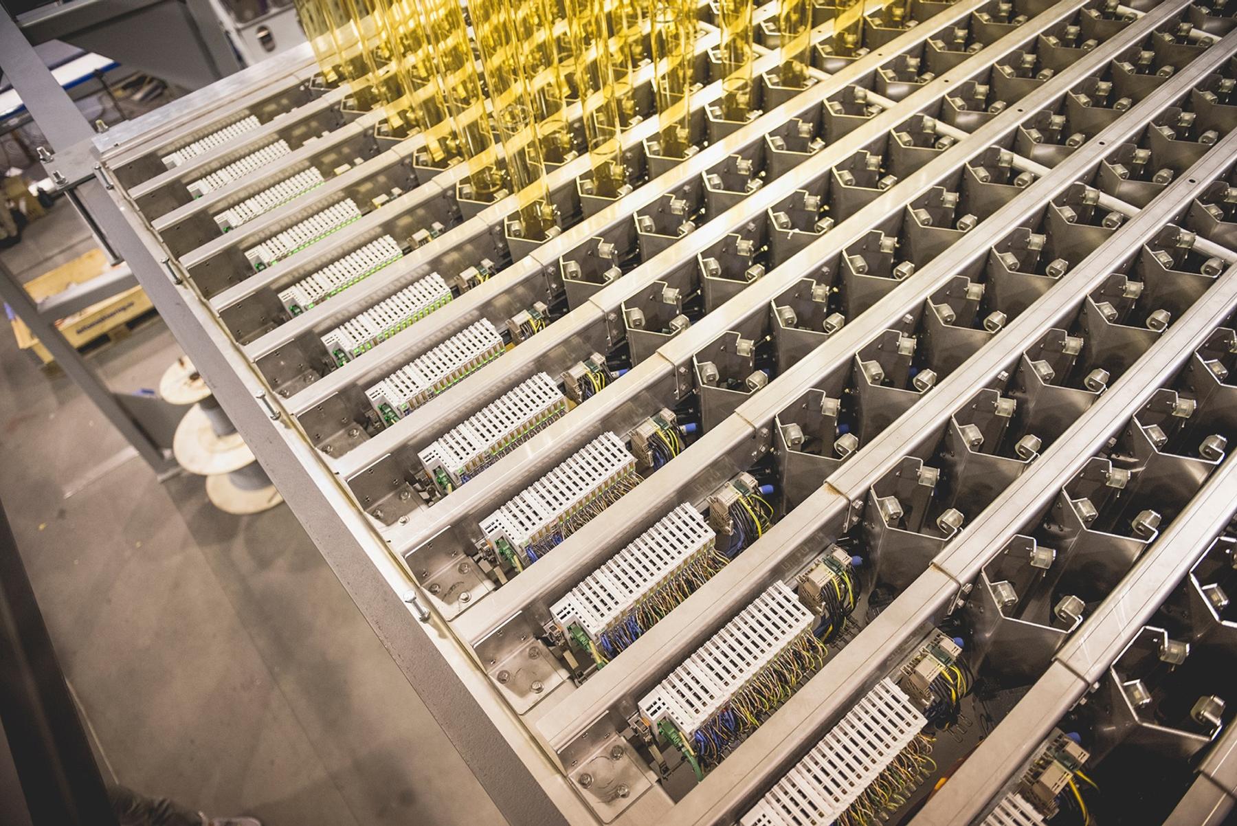 The installation comprised 529 custom-made brackets designed to control each individual pipe's motion, with each module containing a flexible stainless steel construction housing an industrial servomotor, drive wheels, and capacitive sensors.