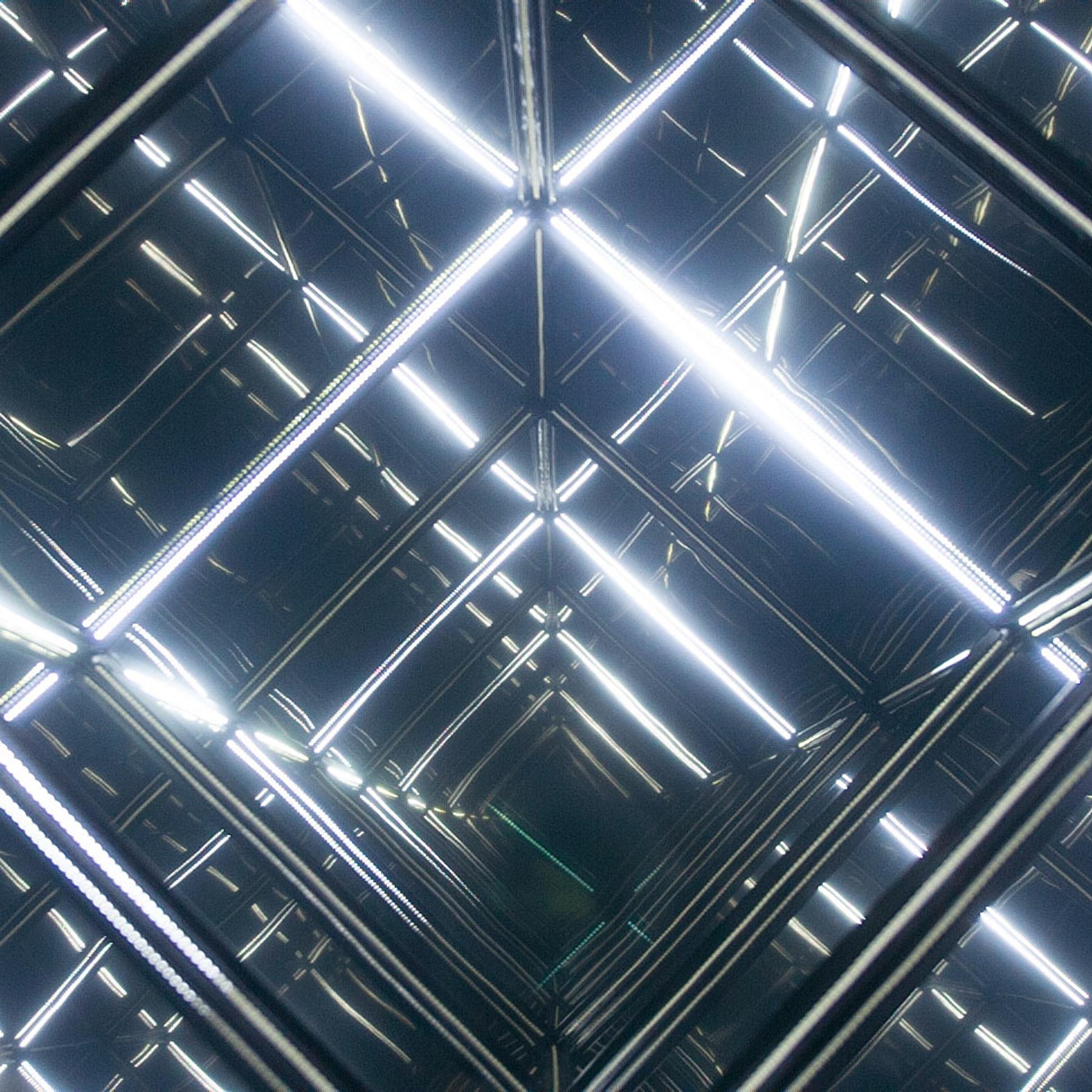 The sculpture consists of six mirror-foiled acrylic plates attached to a custom welded steel frame, creating a geometric form that reflects and refracts light throughout its structure. A total of 1,340 LEDs are mounted along the interior edges of the frame, controlled by a computer system housed in the installation's base. This technical infrastructure enables precise choreography of light sequences that travel along the sculpture's perimeter, creating the illusion of electrical impulses propagating through a three-dimensional nervous system.