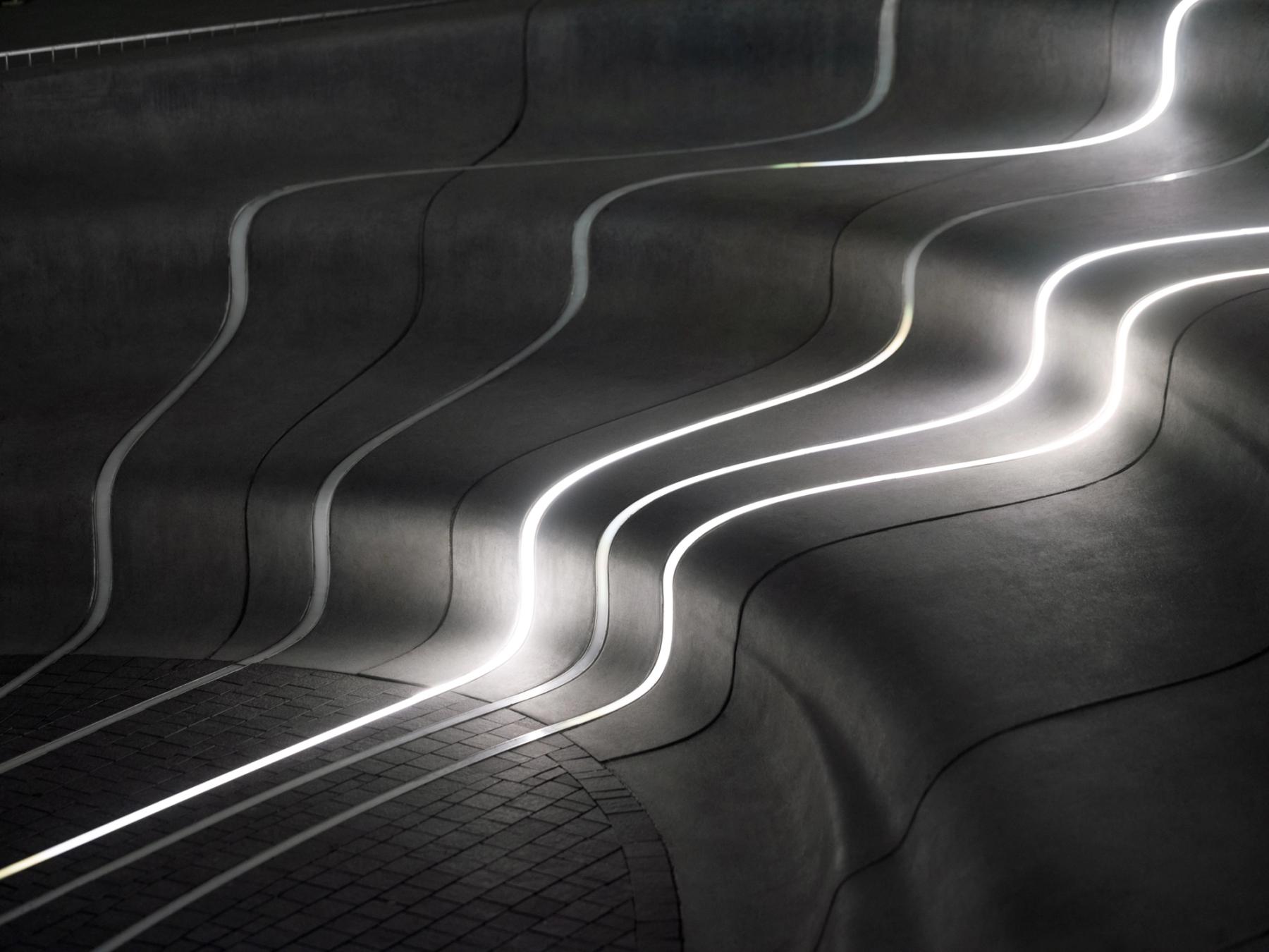 The installation employs aluminum profiles lined with acrylic glass, set flush with existing paving and concrete surfaces to create seamless integration with the urban infrastructure. Flexible, waterproof LED strips inserted into these channels feature individually controllable four-centimeter segments that respond to 24 motion-sensing cameras positioned throughout the site. This sensor network detects visitor presence and generates dynamic "waves" of illumination that follow pedestrian movement, creating an interactive relationship between human activity and environmental response.