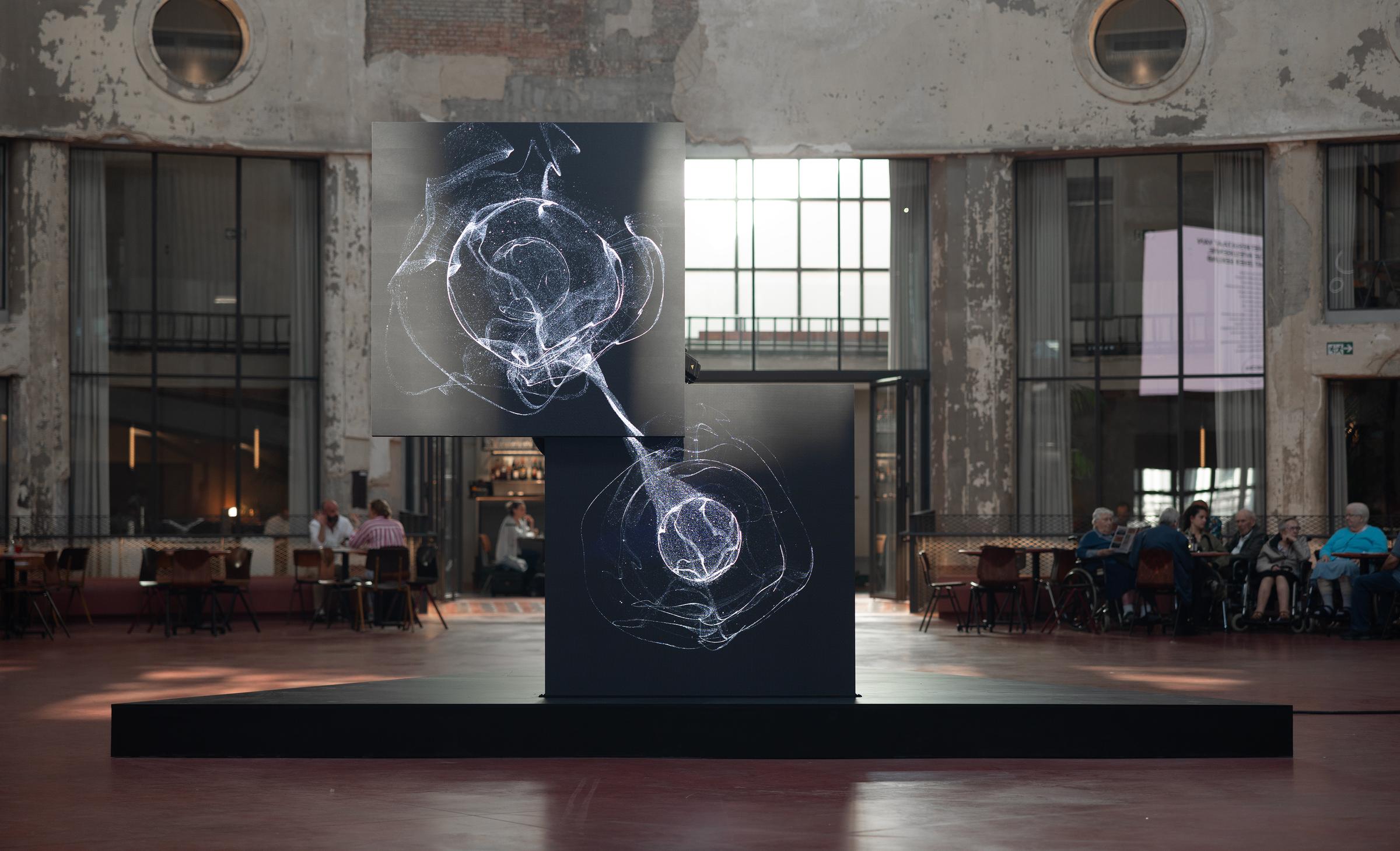 As a continuation of the Entangled project, the Entangled Installation translates the cross-chain particle interactions into a large-scale kinetic sculpture at Wintercircus in Ghent, Belgium. Instead of executing pre-programmed industrial tasks, a robotic arm is subverted into a replacement of the human hand, reenacting gestures from the digital artwork at architectural scale.