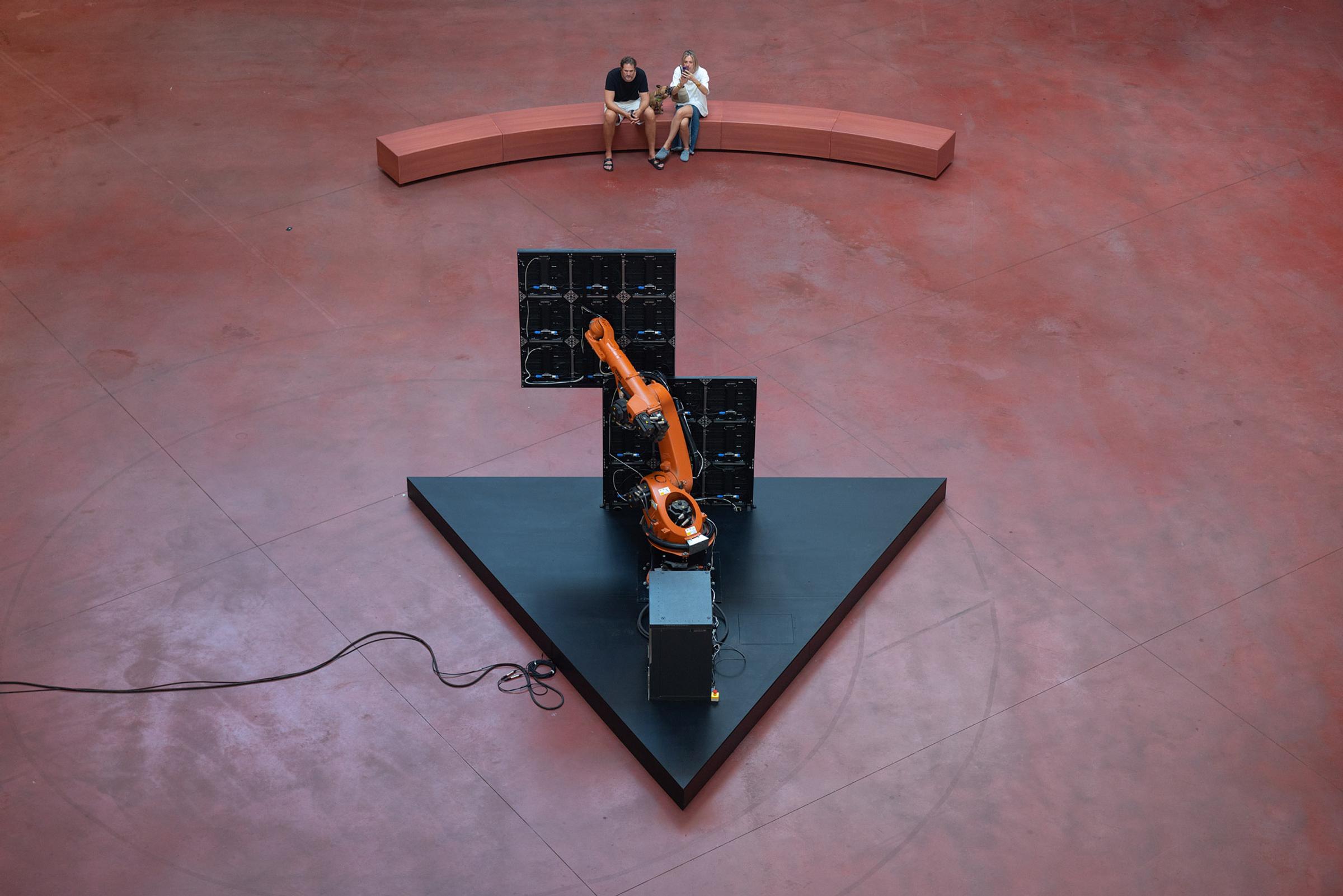 The kinetic sculpture was specifically designed for the monumental space in which it was placed, with the robotic arm mounted at the center of a triangular base facing the main exhibition area. Engineered to provide unrestricted mobility, the installation allows the arm to move a large scale LED-panel around, behind and partially in front of a stationary panel mounted in front of the robot. While the front of the installation presented the primary visual experience, the work was designed to be encountered from multiple vantage points, with the rear view revealing the contrast between the raw machine aesthetics and intricate motion that orchestrates the synchronised movement.