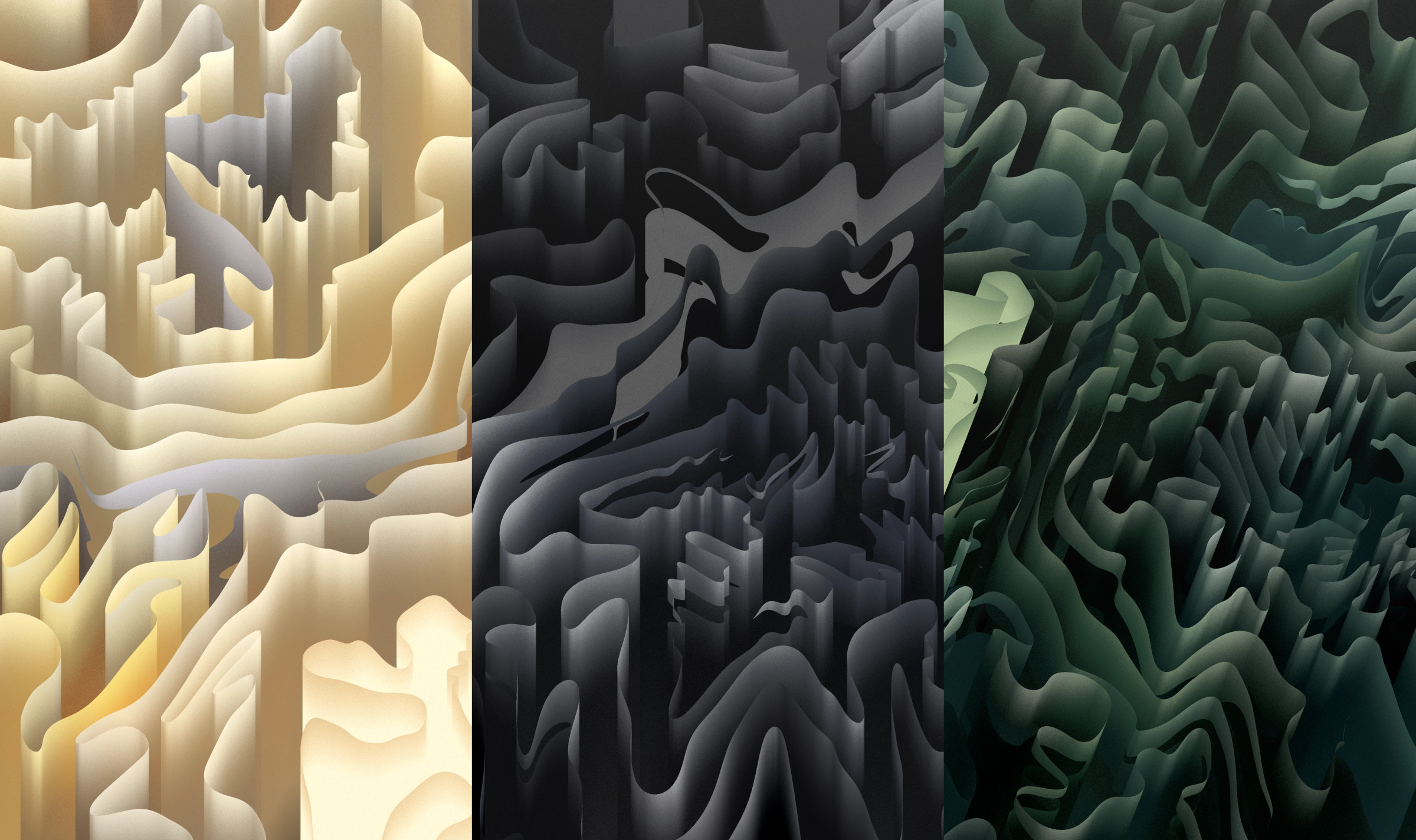 Through an interplay of 3D- and 2D-aesthetics, each iteration of the series generates a unique tapestry of shades and shapes aimed at creating space for interpretation, rather then directly mimicking the natural world. While a near endless combination of complex gradients seeks to capture the richness and subtlety of natural light interacting with organic material, contrasting fields of bright color reminds us that digital systems are unbound by natural laws.